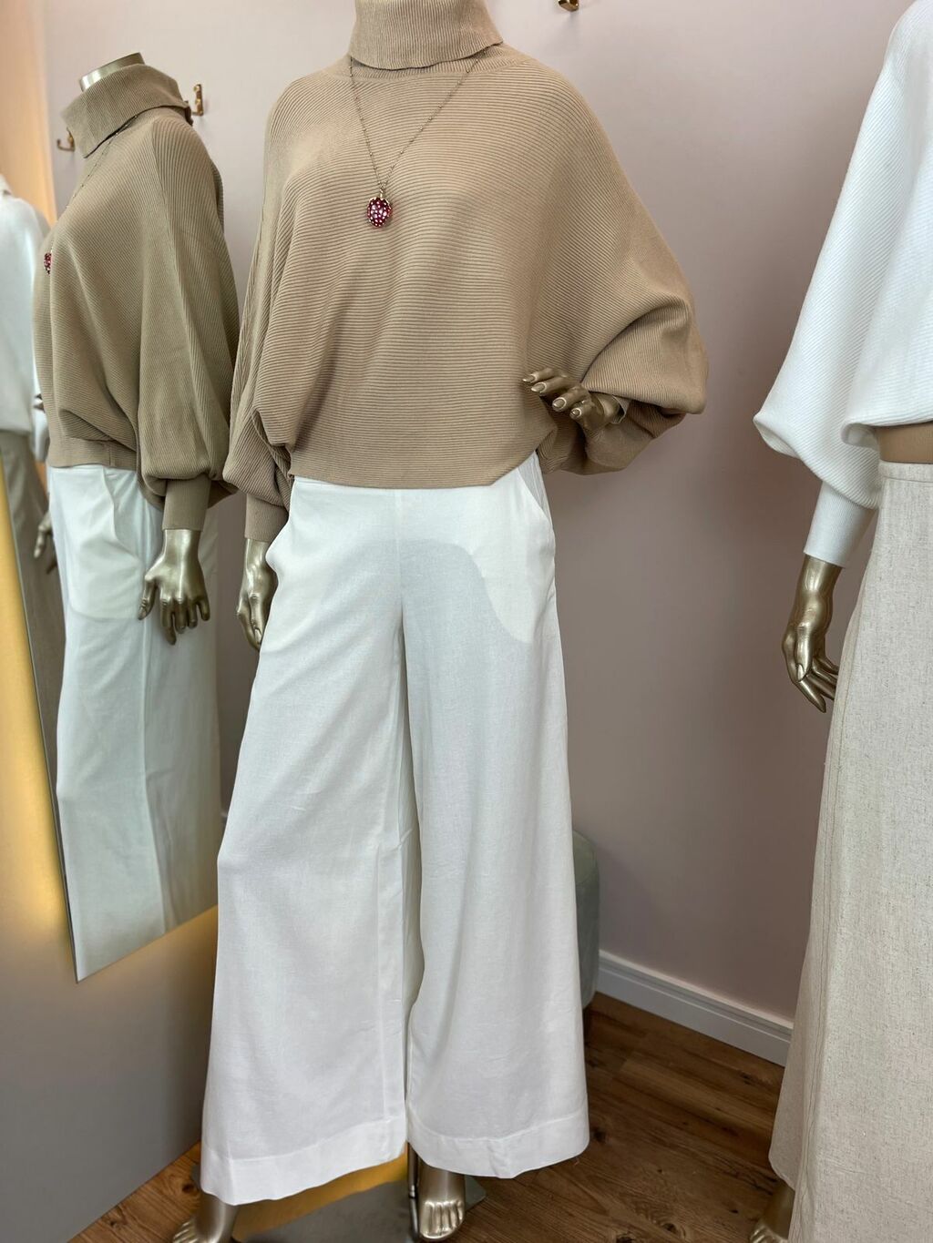 A calça pantalona é confeccionada em linho com elastano. Peça possui cós largo, bolsos frontais, bolsos posteriores e fechamento por zíper na lateral esquerda. Modelo traduz o tradicional corte da alfaiataria com o conforto e fluidez da moda moderna. Aposte em peças que alongam a silhueta para compor looks incríveis para todas ocasiões.