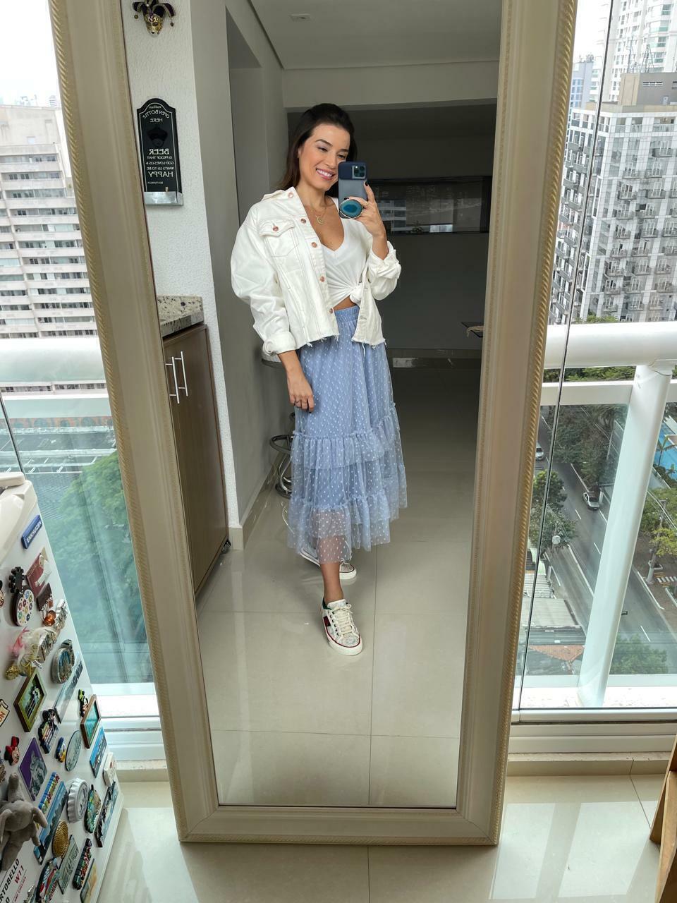A Saia Patrícia é perfeita para um visual versátil e garantia de você se sentir deslumbrante e confiante. Em tom azul com estampa poá em tule, ela traz delicadeza para o seu look. Com comprimento midi e forro, essa saia tem um estilo feminino e elegante ideal para uma saída casual ou ocasião especial!